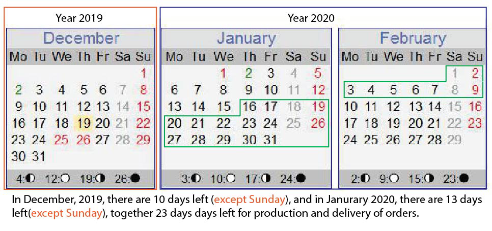 Our 2020 lunar Chinese new year holiday will start from January 16th, 2020. Before the deadline, we have total 23 days (count from the date of 2019-12-19) to manage the production and delivery of orders. (the time exclude Christmas holiday and Sunday).