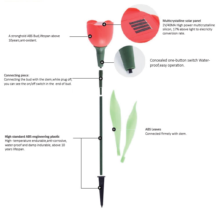 Solar flower light is a kind of artificial flower combined with led lamps. Characteristics of solar flower light is that it not only used to decorate traditional artificial flowers but also provides people the light and giving out a wonderful decorating effect at night.