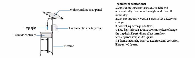Our solar pest-killer lamp is a physical insect killing device designed according to insects' natural tendency to move toward the light, this lamp can give out strong insect attracting light waves, accompanying with odor induction and flash stimulation, can reach a great pest killing effect. It got great recognition from the plant protection department, public plant protection personage and farmers after years of practical application. It was generally recognized that our solar pest-killer lamp using multi-methods to induce and kill pests simultaneously and effectively in a great variety and quantity, and can greatly reduce pest egg dropping, pest population base, and density. In the meantime, our solar pest-killer lamp can protect the pest’s natural enemies, delay pest resistance to insecticide, harmless to people and animals. In addition, our solar pest-killer lamp has low utilization cost, great using freedom, and convenient to move can be placed anywhere if you want.