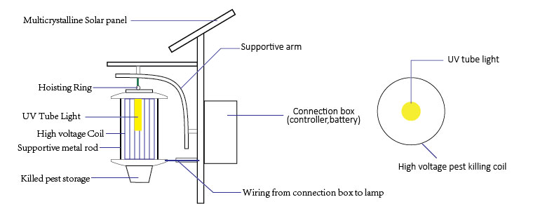 Our solar pest killing lamp utilized the phototaxis and phonotaxis phenomenon of pest, using light, wave, and color to allure pest bump on a high voltage coil surrounded the long-wave UV light tube. Alluring the pest nearby with light and far away with waves, plus the yellow color and odor, to make the pest come close to be killed on the high-voltage coil. The solar pest killing lamps are diversified into five parts:1, Controller 2, UV light tube, 3, High voltage coil 4, Insulative Frame 5, Assistant structure. The controller controls the lamp automatically turn on at night and turn off on day and rainy days.